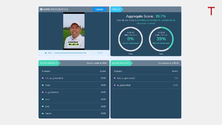 Tempo kemudian melakukan pemindaian menggunakan Hive Moderation. Hasilnya menunjukkan bahwa 39,7 persen video yang beredar itu meteknologi akal imitasi.