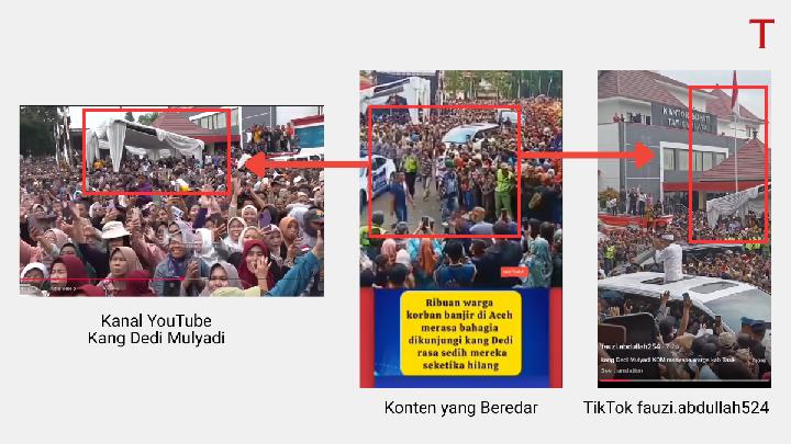 Video itu berisi lautan manusia yang menyambut kedatangan Dedi Mulyadi. Pengunggah konten memuat narasi bahwa kedatangan Dedi tersebut disambut ribuan warga Aceh dan Padang yang terdampak bencana banjir bandang dan longsor.